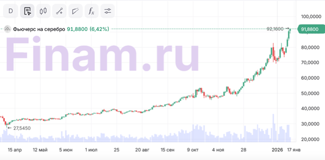 Драгметалл активно растет четвертый день подряд, за это время подорожав на 21,6%. Участники рынка скупают серебро на фоне неопределенности, вызванной противостоянием президента США Дональда Трампа и главы ФРС Джерома Пауэлла и продолжающимися беспорядками в Иране, пишет The Wall Street Journal.
