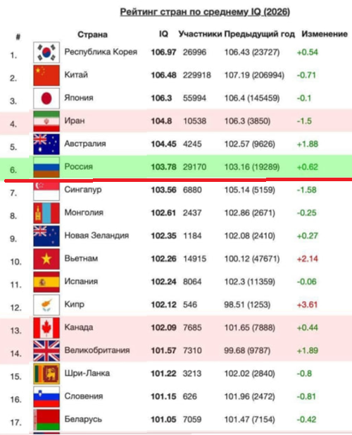 Рейтинг IQ представляет собой среднее количество баллов, набранных интернет-пользователями из разных государств при прохождении теста на уровень интеллекта с января по декабрь 2025-го года. 1,2 миллиона человек выполнили на портале одинаковые задания для оценки своих интеллектуальных способностей.