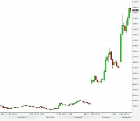 Параллельно с газом дорожает и нефть. Стоимость майских фьючерсов Brent на лондонской бирже ICE подскочила сегодня примерно на 9% и подбирается к отметке в 85 долларов за баррель. Причина та же — перебои с поставками через Ормузский пролив, через который проходит до четверти мировых поставок нефти. Страховщики начали отказываться страховать танкеры в этом регионе, что грозит дефицитом сырья до 10 млн баррелей в сутки. Инвесторы в панике уходят в защитные активы, раскручивая цены на драгоценные металлы: золото на Comex торгуется около 5366 долларов за унцию, продолжая ралли.